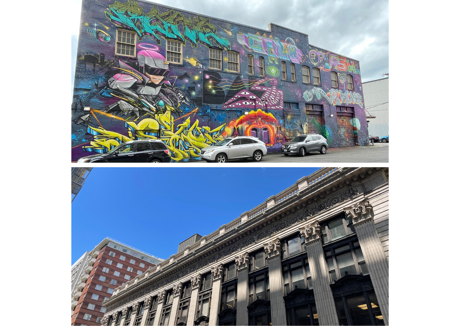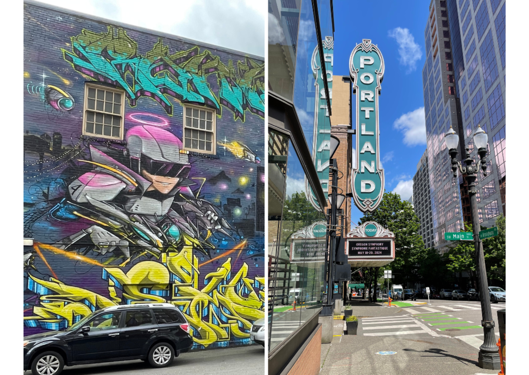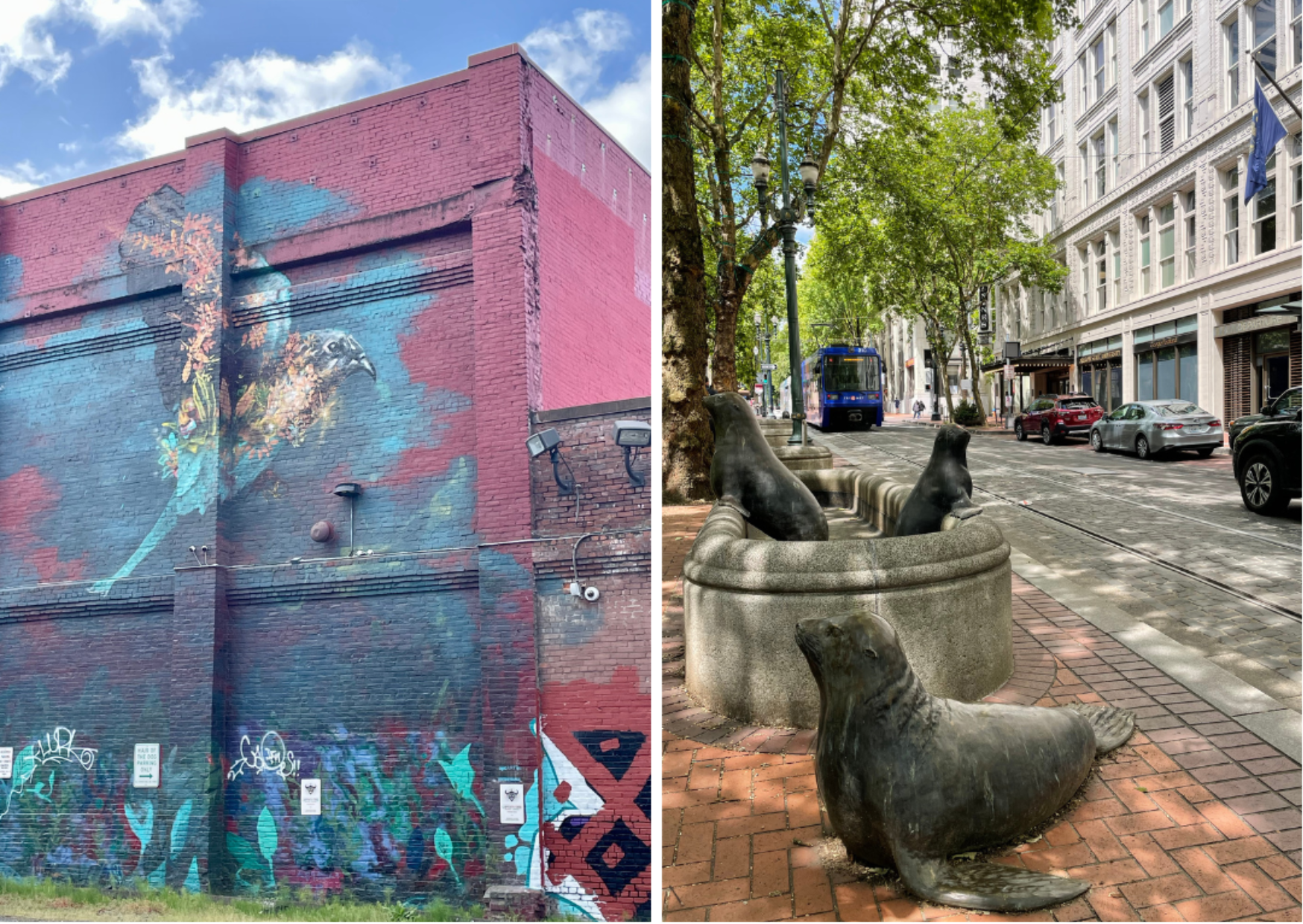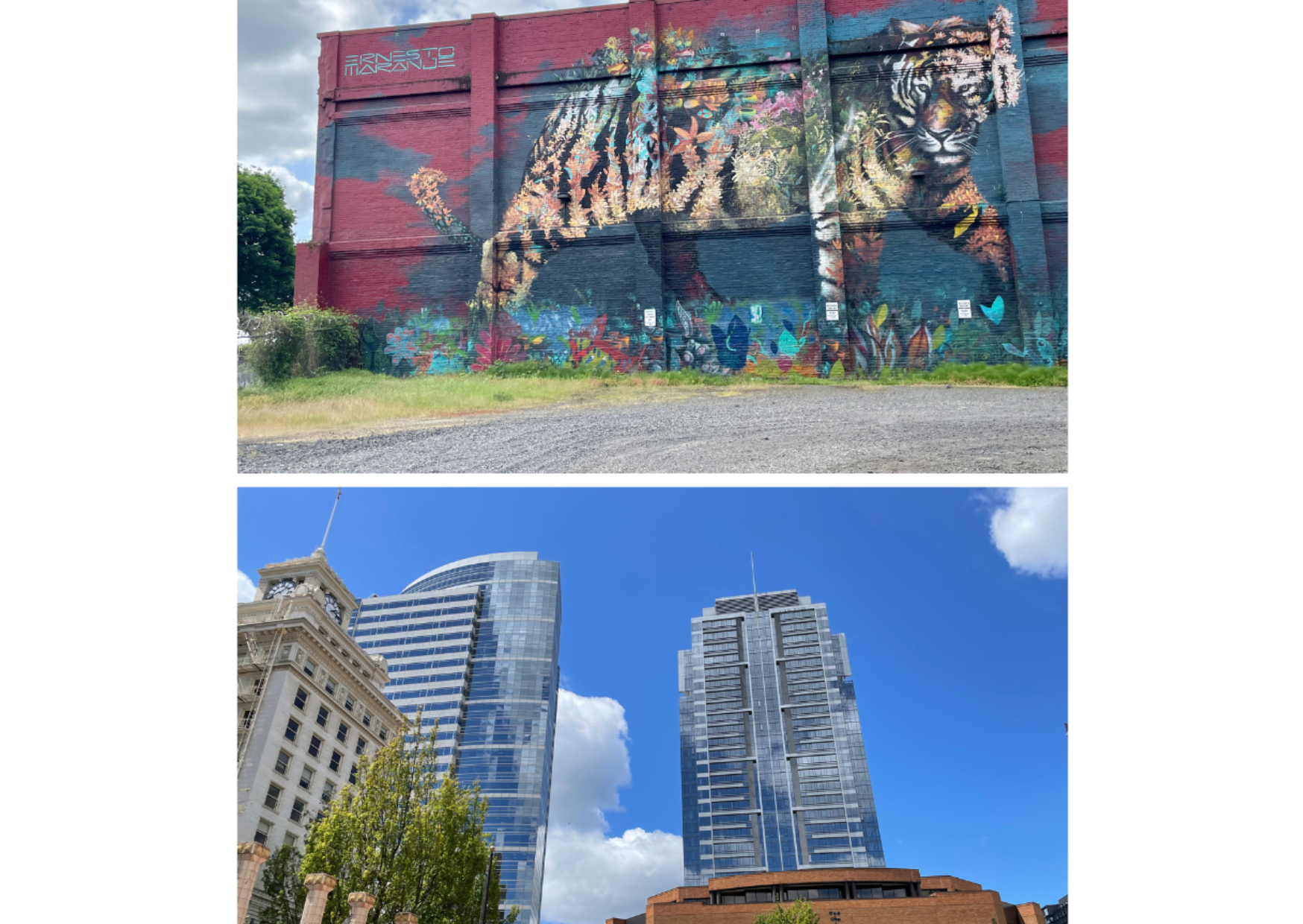 At the end of my tourist journey, I looked at my photos and realized that I had an interesting bunch of images made up mostly of two very distinct and specific subjects. Not deliberate choices but ones that happened spontaneously: architecture, featuring old and new buildings and art and graffiti decorating walls. The images were taken either in Downtown Portland or the East Side of PDX, and the visual juxtaposition that emerged from those images highlighted the vibes of this wonderful, vibrant and happening city that is full of expression, never dull, always eye-catching.
